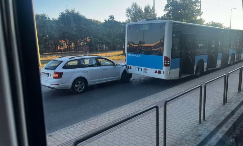 A Volánbusz járműve éppen a megállóban tartózkodott, amikor az egyik autós a busz bal hátsó sarkának ütközött. Az olvasónk által küldött fotókon jól látszódik, hogy az autóban keletkezett nagyobb kár.