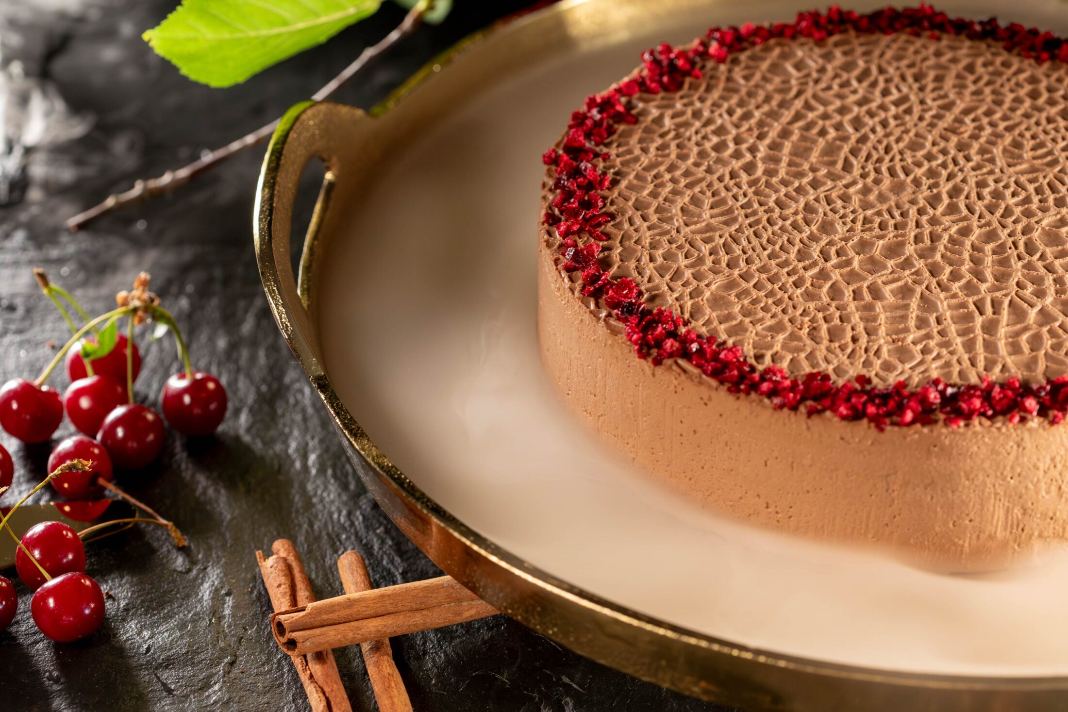 “Egy édes álomból született: Alfréd egy éjjel megálmodta a tortát, reggel papírra vetette, majd megsütötte – és apróbb módosításokkal tökéletesítette. Az eredmény? Egy békebeli hangulatú desszert, ami megidézi a klasszikus Lúdláb vagy Rigójancsi ízvilágát – hozzáadott cukor nélkül! A tortában kakaós-mandulalisztes piskótalapok között fahéjas, chiamagos meggyragu bújik meg, amit enyhén édes tejcsokoládékrém ölel körbe. A roppanós textúrát pedig kakaóbab töret adja. Egy igazi mestermű!”
