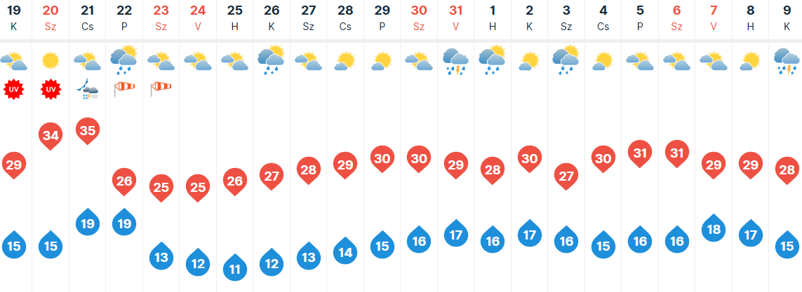 Szerdán Szegeden sok napsütésre van kilátás, majd a napos időt délután nyugaton és északnyugaton már vastagabb felhők zavarhatják meg. Késő délután, este nyugaton és északnyugaton helyenként futó zápor, zivatar már kialakulhat. A déli, délnyugati szél sokfelé élénk, néhol erős lesz. Visszatér a kánikula, 30-35 fokra készülhetünk délután.