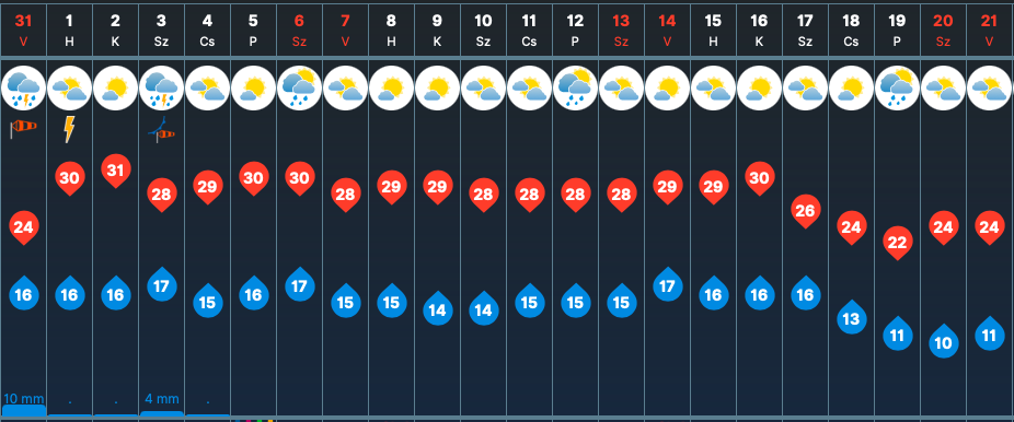 Hétfőn zivatarok már csak elszórtan fordulhatnak elő, és a közepesen felhős égbolton a nap is kisüthet. A legmagasabb hőmérséklet ekkor 30 fok lesz, éjszaka azonban 16 fokig is lehűlhet a levegő.
