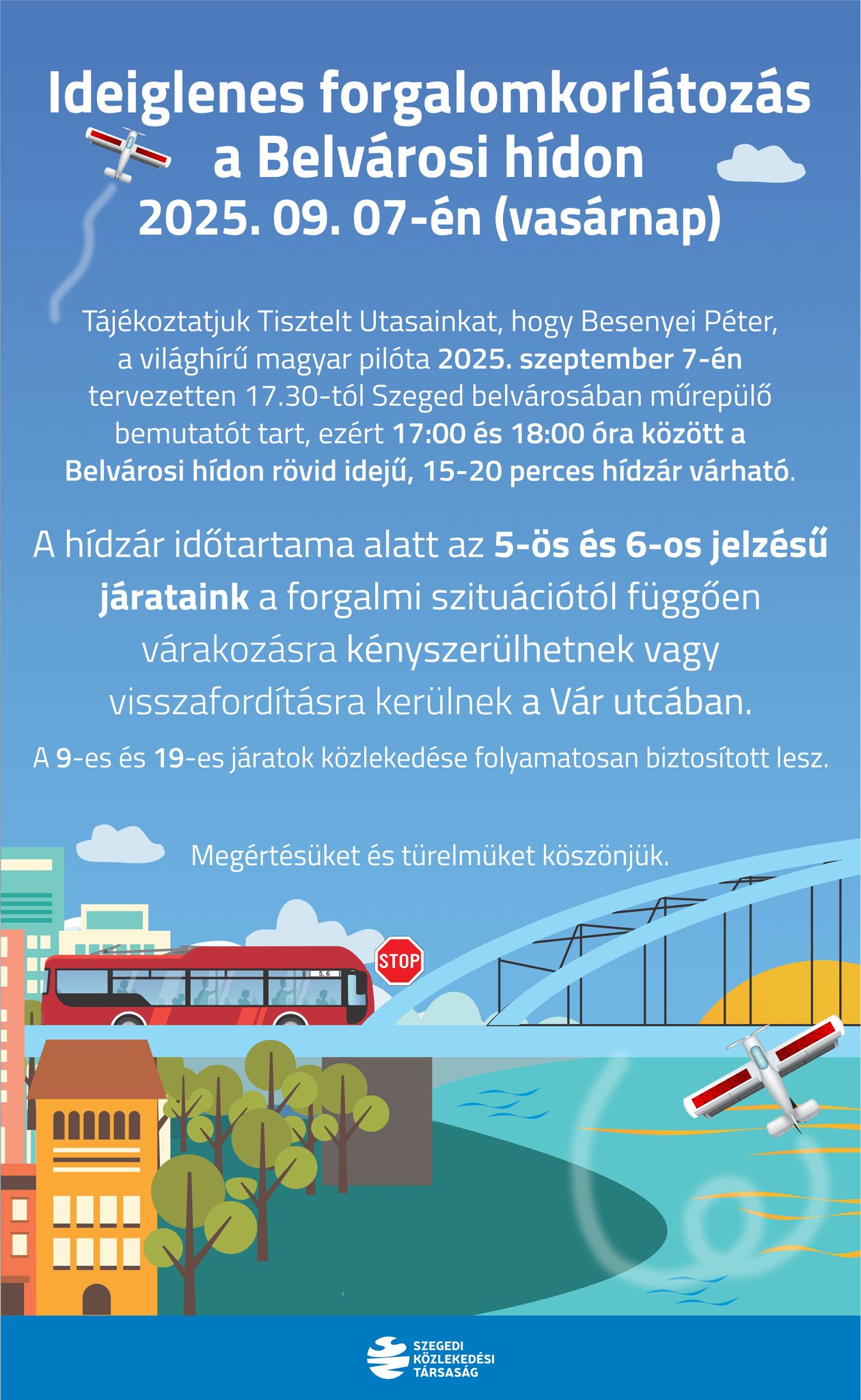 “Besenyei Péter, a világhírű magyar pilóta 2025. szeptember 7-én tervezetten 17.30-tól Szeged belvárosában műrepülő bemutatót tart, ezért 17:00 és 18:00 óra között a Belvárosi hídon rövid idejű, 15-20 perces hídzár várható” – írja a Szegedi Közlekedési Társaság a közösségi oldalán.