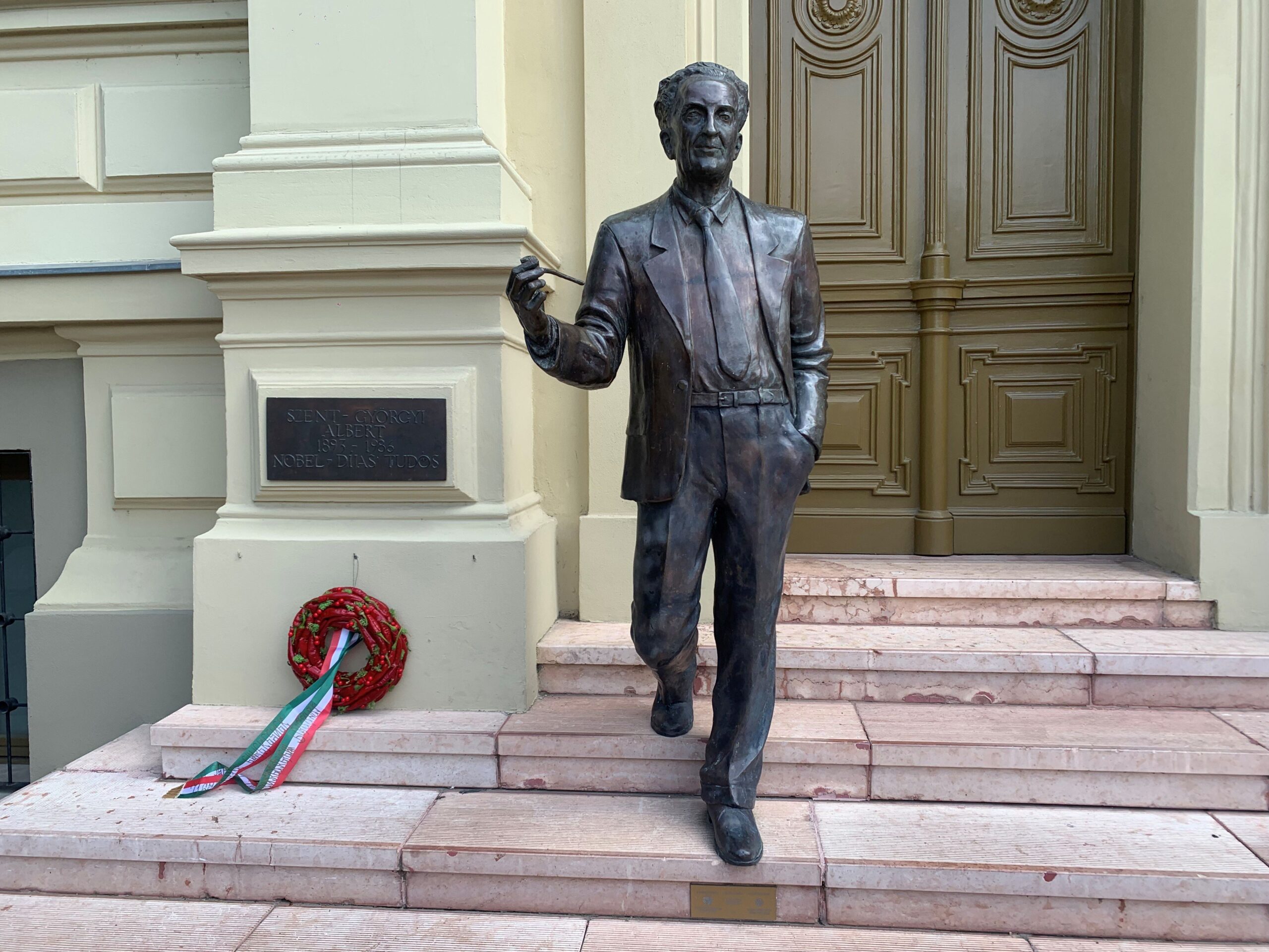 A kedd délutáni eseményen Prof. Dr. Rovó László megemlékező beszédet tartott, az SZTE Juhász Gyula Gyakorló Általános Iskola diákjai pedig Radnóti Miklós Bájoló című versének megzenésített változatával tisztelegtek Szent-Györgyi Albert előtt a Dugonics téri Rektori Hivatal épületénél.