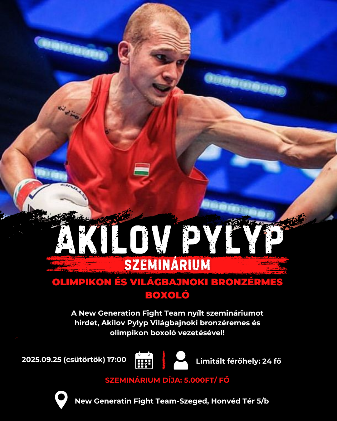 Szeptember 25-én a New Generation Fight Team vendége lesz Akilov Pylyp, olimpikon és világbajnoki bronzérmes ökölvívó, aki nyílt szemináriumot tart a Szegedi érdeklődők számára, aki nemcsak technikai és taktikai tudását, hanem a profi sporthoz szükséges mentalitását is megosztja a résztvevőkkel.