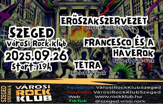 Pénteken este a Városi Rock Klub színpadán a punk kerül a középpontba, három energikus zenekarral, akik garantáltan felforrósítják a hangulatot. Az estét az ERŐSZAKSZERVEZET nyitja, akiknek neve önmagában előrevetíti a harapós, kompromisszummentes megszólalást. Őket követi a FRANCESCO ÉS A HAVEROK, akik laza, mégis tömény lendületükkel hozzák a punk igazi közösségi élményét. A sort a TETRA zárja, akik változatos stílusukkal, de ugyanúgy nyers energiával biztosítják, hogy a közönség az utolsó akkordig ne veszítsen a lendületből. Szombaton pedig a HIDEAWAY lép színpadra, akik a 2000-es évek meghatározó punk-rock slágereit hozzák vissza a közönségnek.