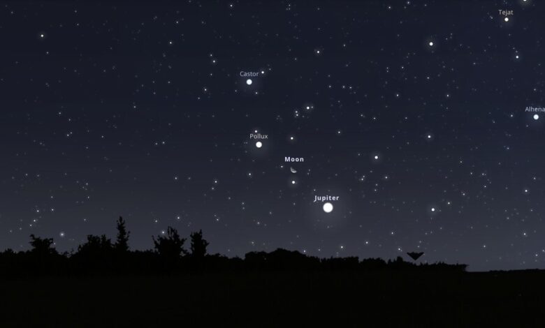 Az együttállás közelében az Ikrek (Gemini) csillagkép két legfényesebb csillagát, a Polluxot és a Castort is megfigyelhetjük.