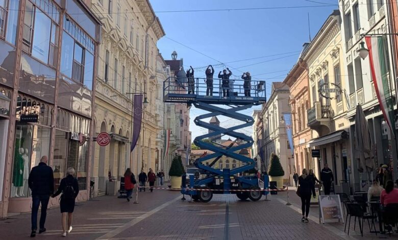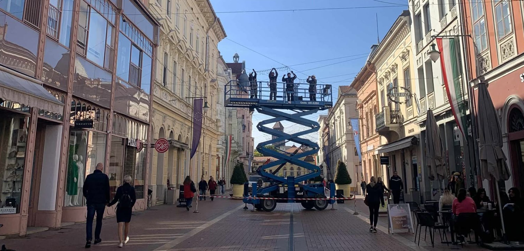 Hamarosan fényárban fog úszni Szeged főutcája: a Kárász utcán már az ünnepi fényfüzérek felhelyezésén dolgoznak a szakemberek