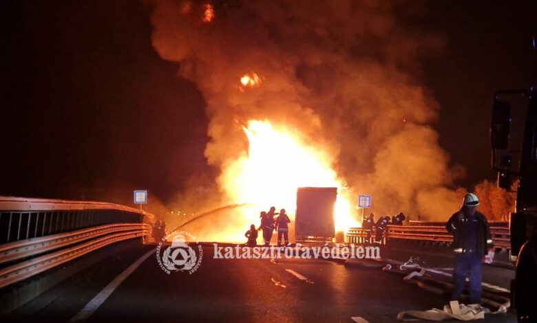 Óriási kamiontűz volt Szeged és Makó között, 29 tűzoltó küzdött a lángokkal