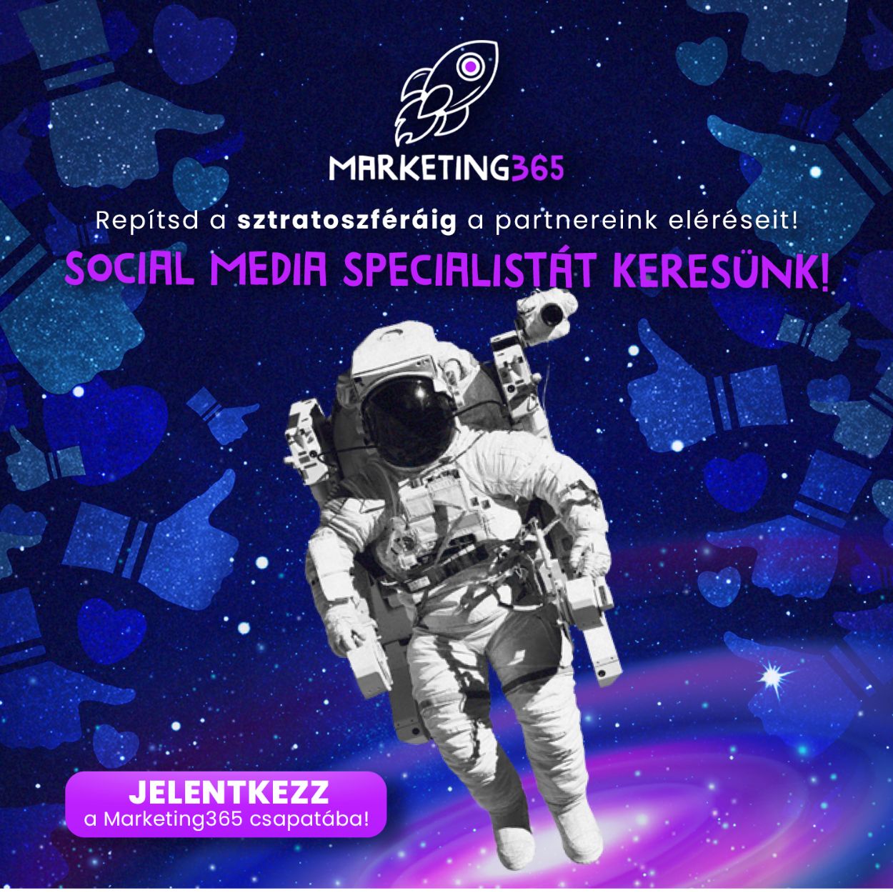 Az új kolléga a 365-ös csapat marketing-divízióját fogja erősíteni, napi 8 órában, korrekt fizetésért, inspiráló környezetben, egy bomba jó brancs tagjaként. A Marketing 365 csapata kb. 50-60 ügynökségi partner social media felületét repíti nap mint nap a sztratoszféráig, helyi vállalkozásoktól kezdve az országos brand-ekig. Hiszünk benne, hogy a sikereink titka a szakmaiság és a kreativitás mellett a lendület, a tűz, a szenvedély, ami áthatja az egész csapatot. Összetartó, pozitív szemléletű, energikus közösség vagyunk, így aztán olyan kollégát keresünk, aki fel tudja venni a ritmusunkat, olyat, aki még egy lapáttal rá tud dobni a körülöttünk lángoló tűzre.