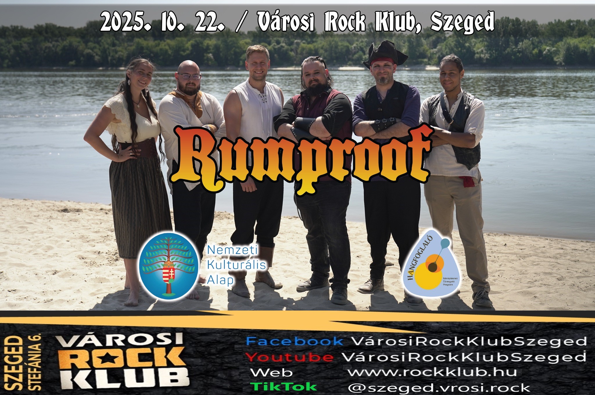 Az NKA és a Hangfoglaló Program támogatásának köszönhetően idén ismét a Szegedi Rock Klub színpadára lép a RUMPROOF zenekar október 22-én. A pécsi illetőségű Rumproof zenekar 2014 novemberében alakult, és a folk-„kalóz”-metál stílust tűzte ki zászlajára. A csapat már fennállásának második évében a magyar underground egyik legtöbbet koncertező bandájának számított, és 2020 márciusáig több mint 300 magyarországi és külföldi fellépést tudhatott maga mögött. A kezdetekben feldolgozásokat játszó zenekar nagyon hamar saját számokra váltotta a repertoárját. A fogós, hegedűvel tarkított dalok szinte azonnal nyitott fülekre találtak. 2025 november 14-én jelenik meg DRUNKEN TALES címmel, és 10 vadiúj nótát, illetve egy régi dal átdolgozását fogja felvonultatni.