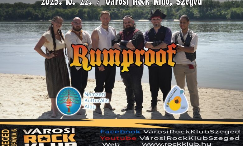 Az NKA és a Hangfoglaló Program támogatásának köszönhetően idén ismét a Szegedi Rock Klub színpadára lép a RUMPROOF zenekar október 22-én. A pécsi illetőségű Rumproof zenekar 2014 novemberében alakult, és a folk-„kalóz”-metál stílust tűzte ki zászlajára. A csapat már fennállásának második évében a magyar underground egyik legtöbbet koncertező bandájának számított, és 2020 márciusáig több mint 300 magyarországi és külföldi fellépést tudhatott maga mögött. A kezdetekben feldolgozásokat játszó zenekar nagyon hamar saját számokra váltotta a repertoárját. A fogós, hegedűvel tarkított dalok szinte azonnal nyitott fülekre találtak. 2025 november 14-én jelenik meg DRUNKEN TALES címmel, és 10 vadiúj nótát, illetve egy régi dal átdolgozását fogja felvonultatni.