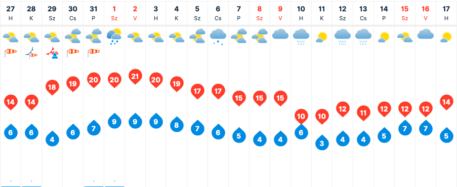 Kedden folytatódik a tipikus őszi időjárás, ezen a napon is 14 fok körüli értékeket mérhetünk majd, és felhős lesz égbolt felettünk. Éjszaka akár 6 fokig is lehűlhet a levegő.