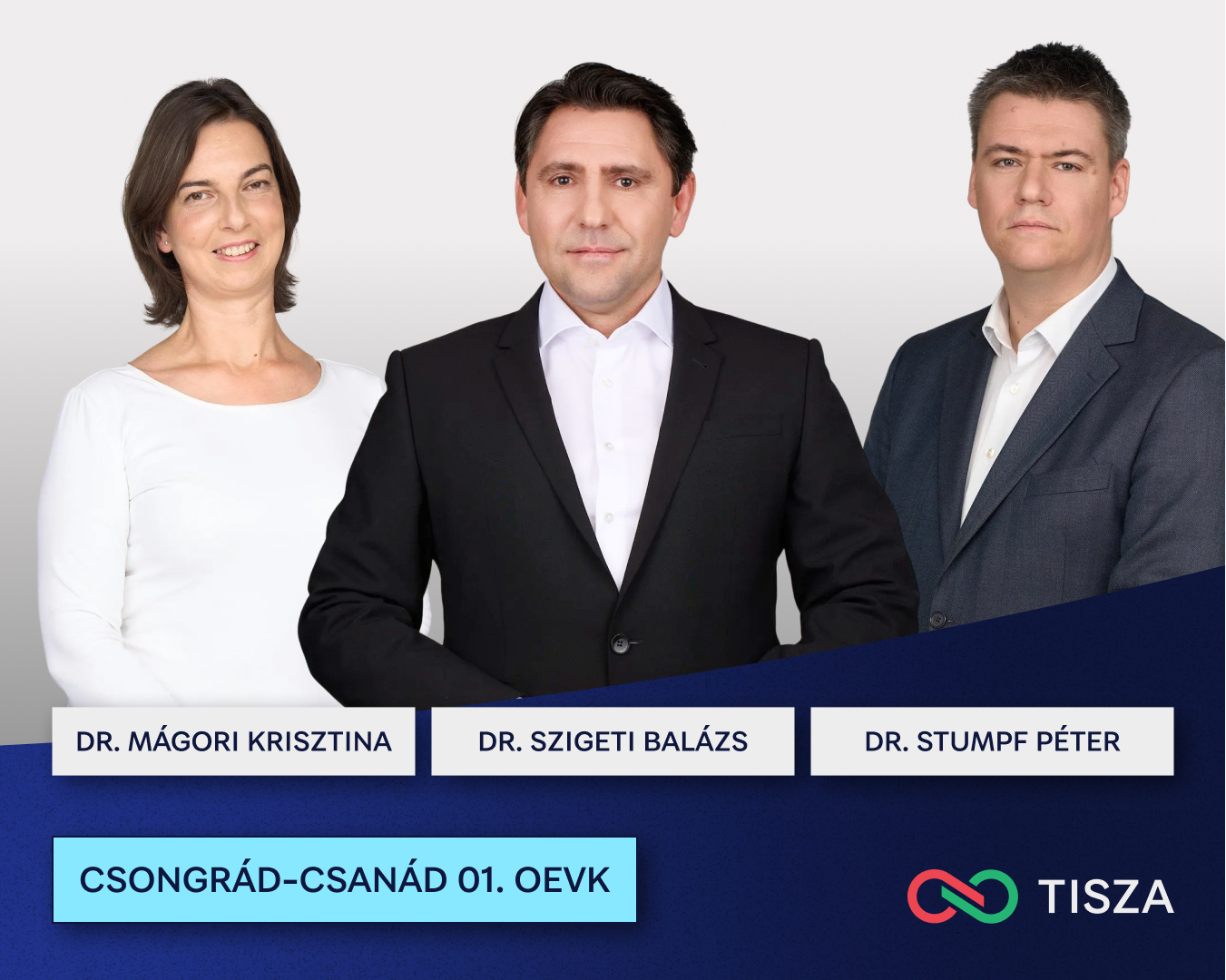 A Csongrád 1-es választókerületben (Szeged) három név köré szerveződik a TISZA: dr. Mágori Krisztina igazságügyi orvosszakértő az ellátórendszer emberközpontú, átlátható átformálását és a prevenciót emeli ki; szegedi fókuszai közt a Tisza-híd ügye és a közlekedési csomópontok biztonsága is szerepel. Dr. Stumpf Péter Bence politológus az uniós források lehívását, a lakótelepek felújítását, a BYD-beruházás környezetvédelmi kontrollját és az egyetemi önállóságot hangsúlyozza. Dr. Szigeti Balázs bűnügyi szakjogász egy élhető, biztonságos várost, jobb közösségi közlekedést és erősebb helyi szociális hálót szorgalmaz.