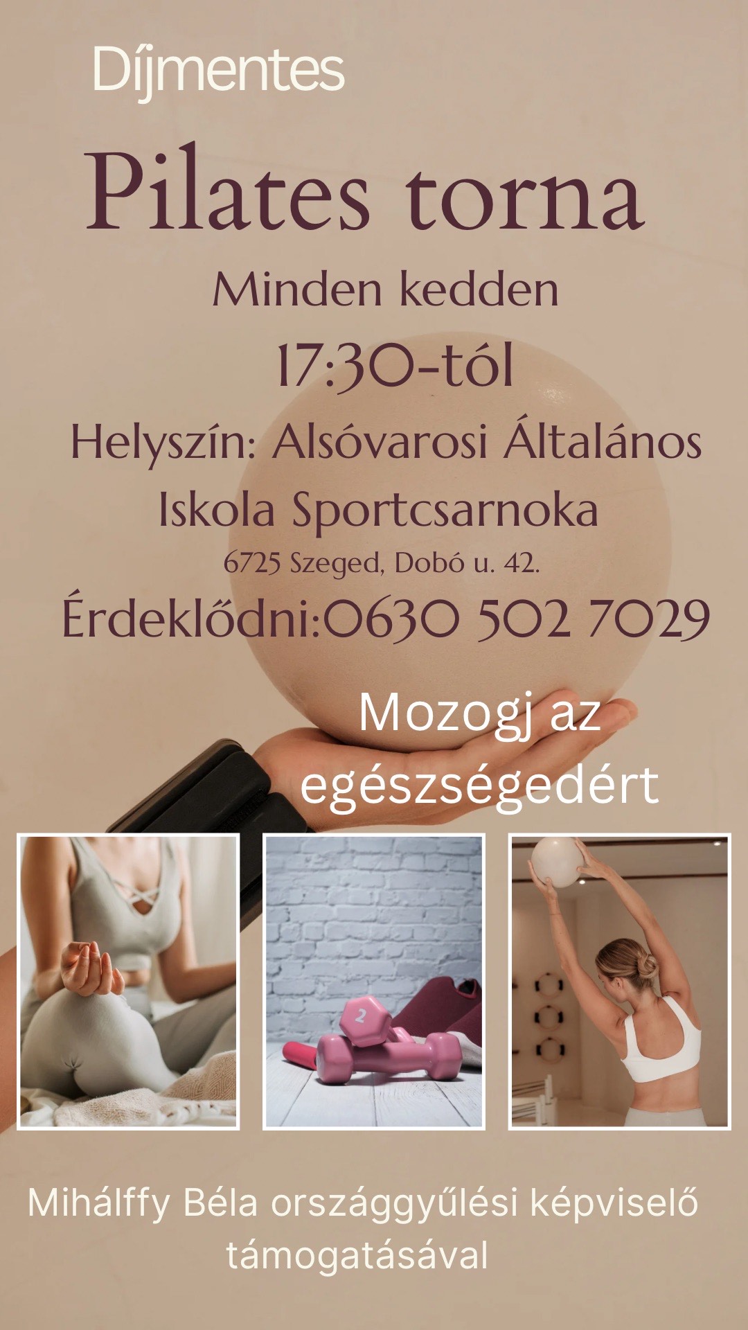 Ahogy közeleg az év vége, sokaknál fogy a motiváció, nő a feszültség, és egyre nehezebb rászánni magunkat a mozgásra. Épp ezért jön most kapóra egy egyszerű, mégis feltöltő kikapcsolódás: keddenként 17:30-tól díjmentes pilates óra vár az Alsóvárosi Általános Iskola sportcsarnokában, Szegeden, a Dobó utca 42. alatt. Nincs belépő, nincs előfeltétel, elég egy kényelmes ruha és egy palack víz. Kezdőknek is ideális, kíméletesen átmozgat, oldja a feszültséget, és segít kiszakadni az év végi hajtásból, hogy újra legyen kedv és lendület. Kérdés esetén a 06 30 502 7029-es számon lehet érdeklődni. A program Mihálffy Béla országgyűlési képviselő támogatásával valósul meg, célja pedig, hogy együtt mozogjunk jó hangulatban, és a leghidegebb napokon is frissebbnek, erősebbnek érezzük magunkat.