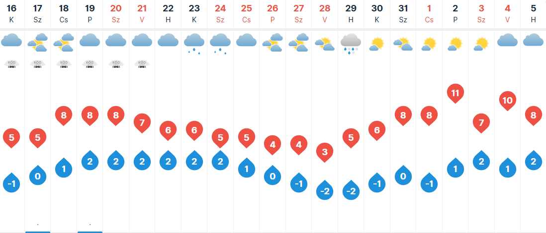 Szerdán többfelé elvékonyodhat, szakadozottá válhat a felhőtakaró, rövid napos időszakok is lehetnek. Emellett azonban borongós, nyirkos tájakkal is találkozhatunk. Gyenge eső, szitálás, ónos szitálás is kialakulhat. A déli, délkeleti szél gyenge, északnyugaton néhol mérsékelt, élénk lesz. A legmagasabb hőmérséklet 3 és 9 fok között várható.