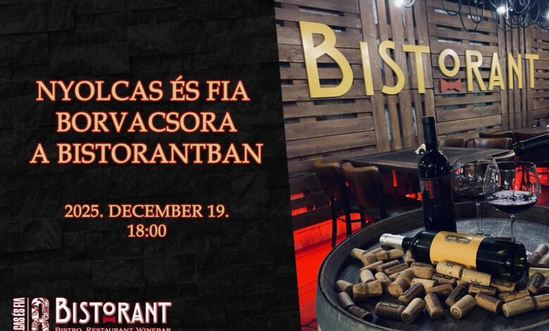Most pedig jön az este, amire decemberben vártál: „Nyolcas és Fia borvacsora” a Bistorantban, 2025. december 19-én, pénteken 18:00-kor. Helyszín: Szeged, Oroszlán utca 8. A program öt fogásból és hat borból áll, ára 21 000 Ft/fő. Asztalfoglalás: +36 30 9 686 686. Részletek és további események ITT. A Bistorant hagyományosan válogatott borlappal és közvetlen, családias hangulattal hozza azokat az esteket, amelyekről napokig beszéltek.