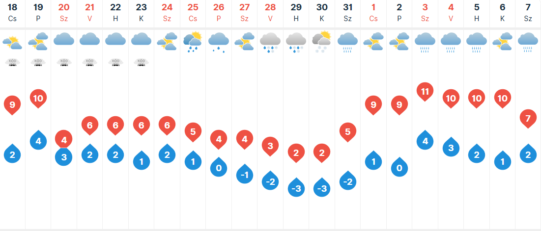 Pénteken is elsősorban délen van esély kevés napsütésre, hazánk nagy részén borongós, ködös, szürke idő várható. Néhol gyenge eső, szitálás, ködszitálás, átmenetileg ónos szitálás továbbra is kialakulhat. A szél nem lesz jelentős. A -2, +5 fokos hajnalt követően napközben 3-12 fok ígérkezik, a naposabb déli tájakon lesz a legmelegebb.