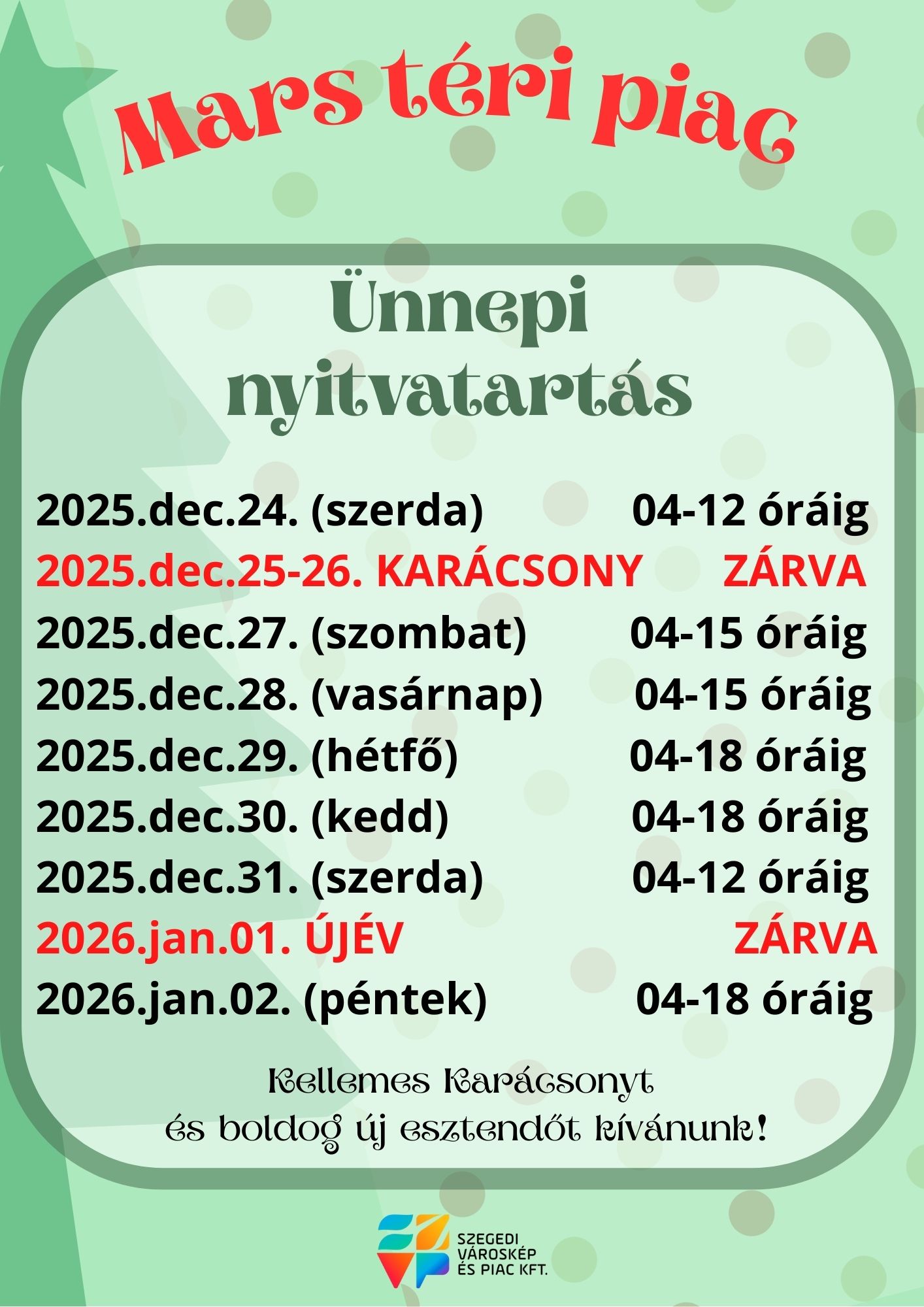 A Mars téri piac nyitvatartása az alábbiak szerint alakul Szegeden: