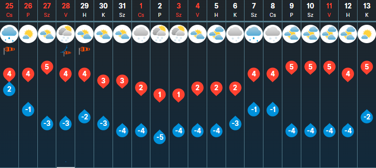 Csütörtökön északkelet felől felszakad a felhőzet, több helyen kisüt a nap, csak a Dunántúlon és délen maradnak meg a felhők. Délen, délnyugaton még többfelé lehet csapadék, a havazás esélye nyugat felé haladva nő, keletebbre, Szeged térségében azonban esőre kell számítanunk. Az északkeleti szelet eleinte többfelé kísérhetik élénk lökések, majd estére mérséklődik a légmozgás. Hajnalban -2, +4, kora délután 0 és 7 fok között alakul a hőmérséklet.