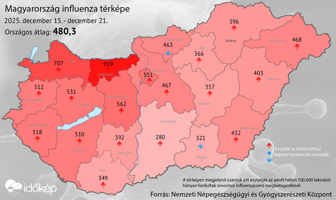 Úgy tűnik, itt a légúti megbetegedések szezonja Magyarországon: a Nemzeti Népegészségügyi és Gyógyszerészeti Központ (NNGYK) legfrissebb jelentése szerint egy hét alatt több mint 250 ezren keresték fel orvosukat akut légúti fertőzés tüneteivel. A jelentés alapján 2025. december 15. és 21. között 46.000 fő jelentkezett influenzaszerű tünetekkel, míg 250.500 fő akut légúti fertőzés miatt fordult orvoshoz.