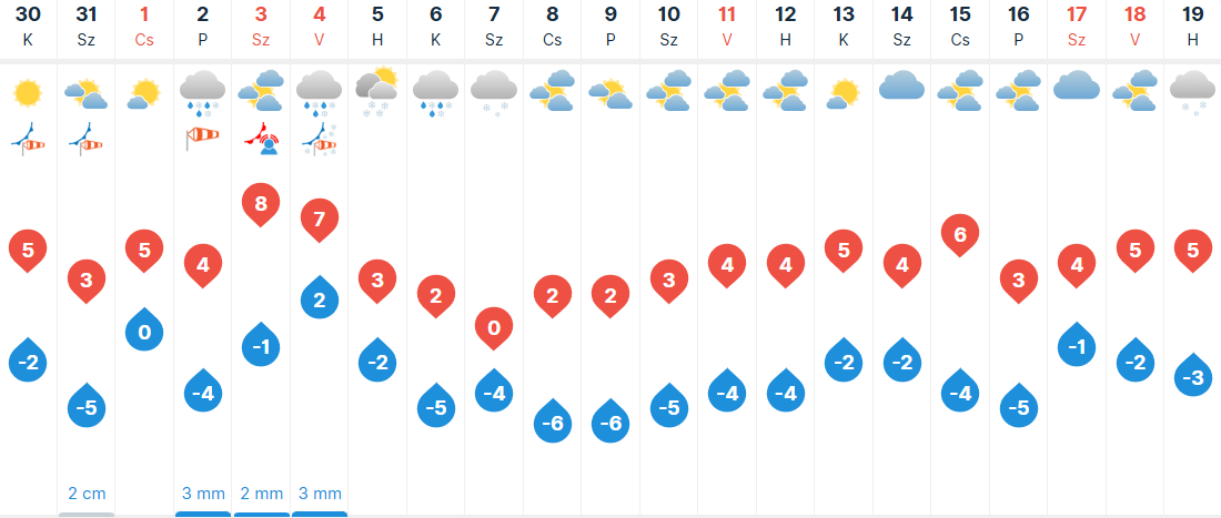 Szilveszter napján a kezdeti napos időt követően gyakran erősen megnövekszik a felhőzet, és többfelé kialakulhatnak hózáporok, az északnyugati tájakon kisebb havazás. Napközben egyre többfelé megerősödik, helyenként viharossá fokozódik a nyugati, délnyugati, majd az északnyugatira forduló szél. Kora reggelre -10 és -2 fok közé csökken a hőmérséklet, napközben pedig csak -3 és +3 fok közötti maximumokra van kilátás.