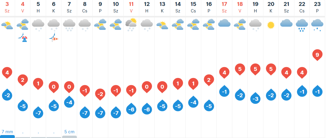 Vasárnapra virradóan nyugaton, majd délen, később keleten várható többfelé hóba váltó csapadék. Napközben ismét egyre többfelé csökken a felhőzet észak felől, de a déli tájak azonban felhősebbek maradhatnak. Több helyen élénk, néhol erős lesz a nyugati, északnyugati szél. Sokfelé fagyos lesz a reggel, majd a legmagasabb hőmérséklet -2 és +3 fok között alakulhat.