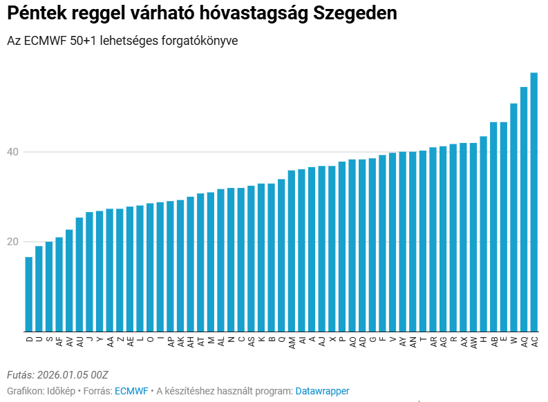 Szegedre vonatkozóan a legtöbb modelltag már 30 centiméter feletti hóvastagsággal számol (amiben már benne van az eddig lehullott hómennyiség is), sőt, néhány „elszálltabb” forgatókönyv az 50 centimétert is átlépi