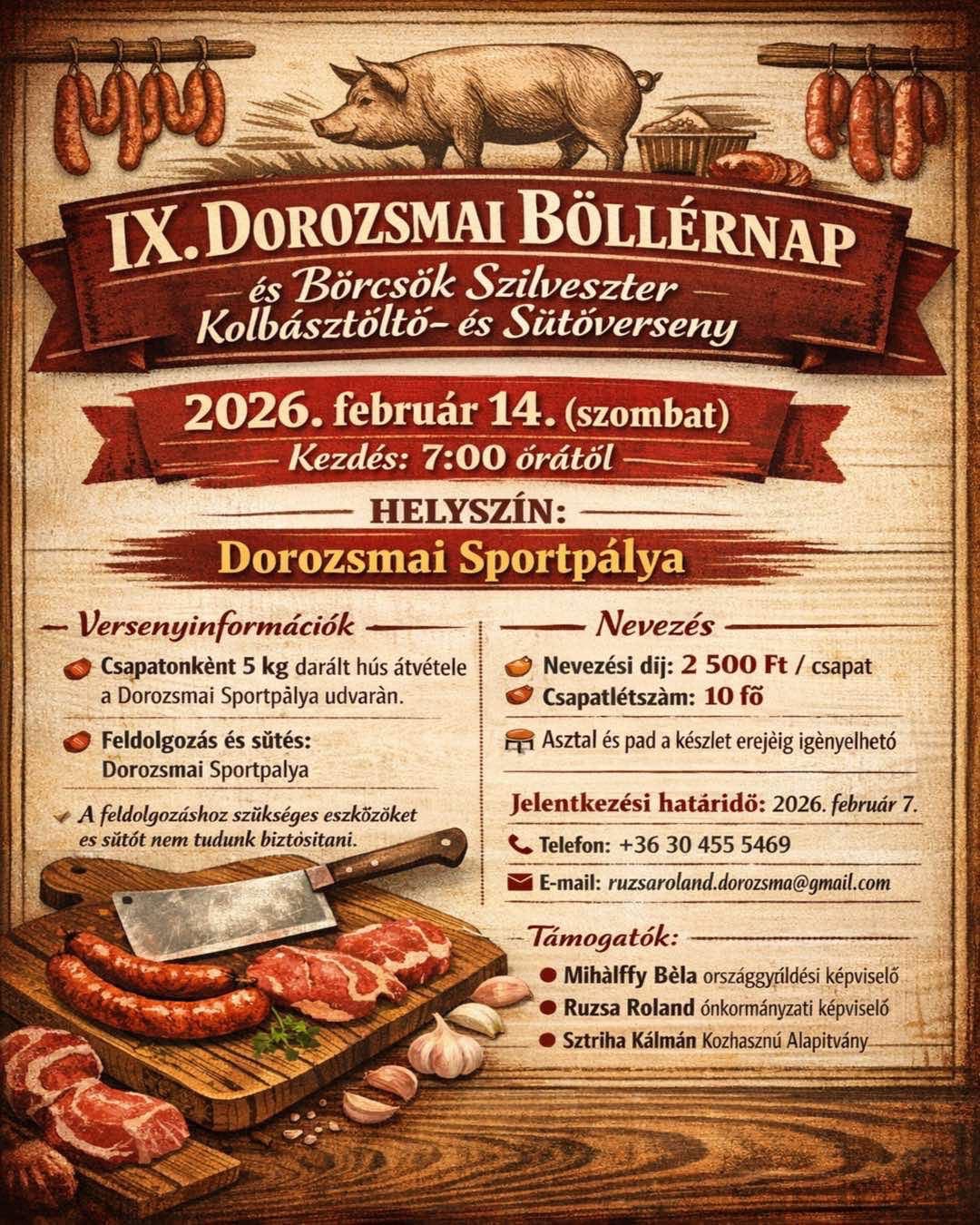 Február 14-én, szombaton ismét benépesül a dorozsmai sportpálya: kilencedik alkalommal rendezik meg a Dorozsmai Böllérnapot és a Börcsök Szilveszter Kolbásztöltő- és Sütőversenyt. A hagyományos közösségi esemény reggel 7 órakor veszi kezdetét, a szervezők idén is jó hangulattal, baráti versengéssel és a helyi közösségek összefogásával várják a csapatokat és az érdeklődőket.