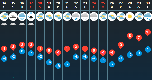Szerdán Szegeden többnyire borongós időre számíthatunk, helyenként tartós párával, köddel. Napos időszakokra kicsi az esély. A nap második felében, estefelé gyenge ónos eső vagy kisebb havazás is előfordulhat, a ködös részeken pedig zúzmarás lerakódás, ónos ködszitálás sem kizárt. A légmozgás gyenge marad. A reggel hideg lesz, napközben pedig 0 fok körüli, kissé fagypont alatti hőmérsékletek várhatók.