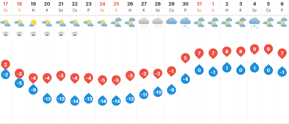 Vasárnap elsősorban az Alföldön lesz tartósan borongós, párás az időjárás, de több tájegységünkön számíthatunk hosszabb-rövidebb napos időszakokra. A párás, ködös tájakon szitálás, ónos szitálás, hószállingózás is előfordulhat. Hajnalban, reggel ismét sokfelé számíthatunk erős fagyra, Szeged környékére -5 fokot jósolnak, majd napközben is csak -2 fok körül alakulhat a legmagasabb hőmérséklet.