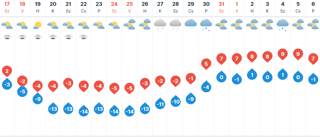 Szombaton már egyre nagyobb területen szakadozhat fel a köd és a rétegfelhőzet, így az ország nagy részén már több-kevesebb időre kisüt a nap. Szegedre közepesen felhős időjárást jósolnak. A Dunántúlon és délen helyenként élénk lesz a keleti, délkeleti szél. A legalacsonyabb hőmérséklet -3 fok körül alakul, kora délután pedig 2 fok körüli maximumokat mérhetünk a városunkban.
