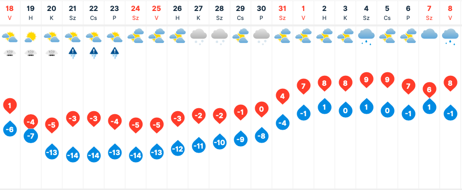 Hétfőn kezdődik azonban az igazi lehűlés, ekkor már napközben is fagyni fog -4 fok körüli értékekkel, éjszaka pedig -7 fokig csökken a hőmérséklet.
