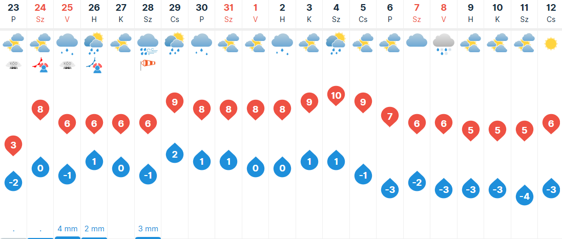 Szombaton többfelé erősen felhős, borult, kezdetben párás, ködös időre van kilátás. Helyenként vegyes halmazállapotú csapadék is előfordulhat, nyugaton és a középső tájakon eső, északon, északkeleten ónos eső. Hajnalban -4, +1, kora délután 0, +8 fok között alakulhat a hőmérséklet.