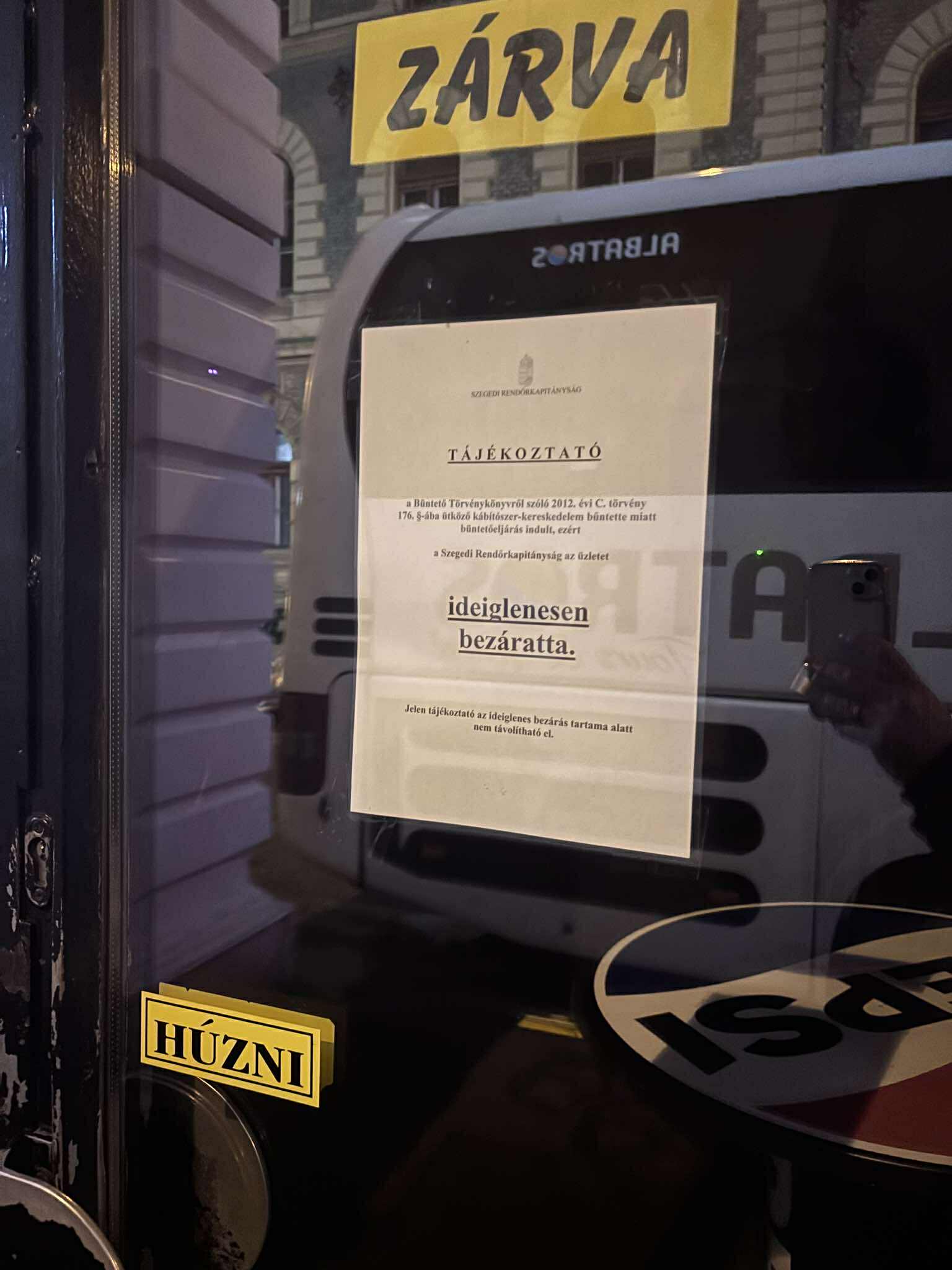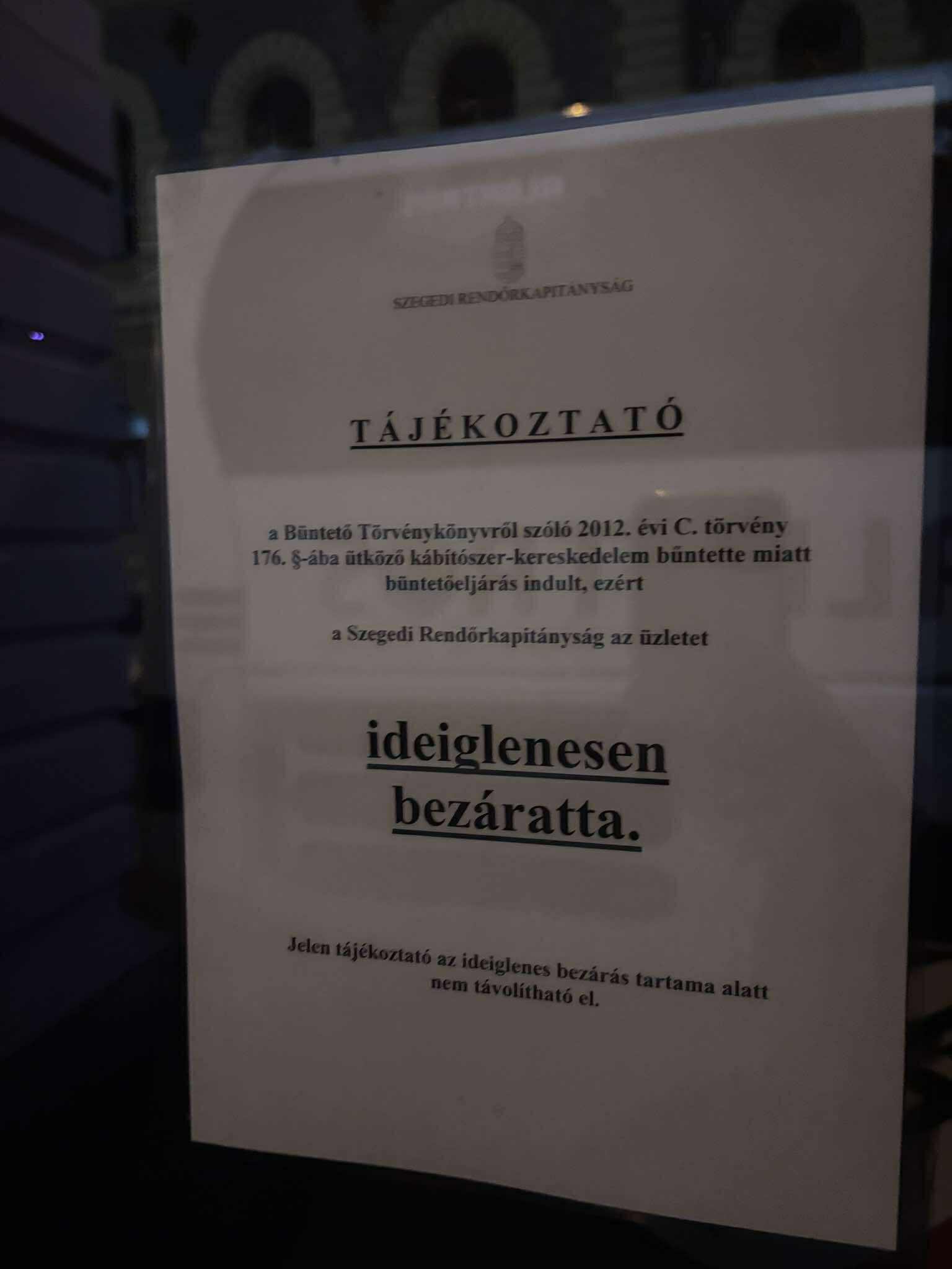 “A Büntető Törvénykönyvről szóló 2012. évi C. törvény 176. §-ába ütköző kábítószer-kereskedelem bűntette miatt büntetőeljárás indult, ezért a Szegedi Rendőrkapitányság az üzletet ideiglenesen bezáratta. A tájékoztató az ideiglenes bezárás tartama alatt nem távolítható el”
