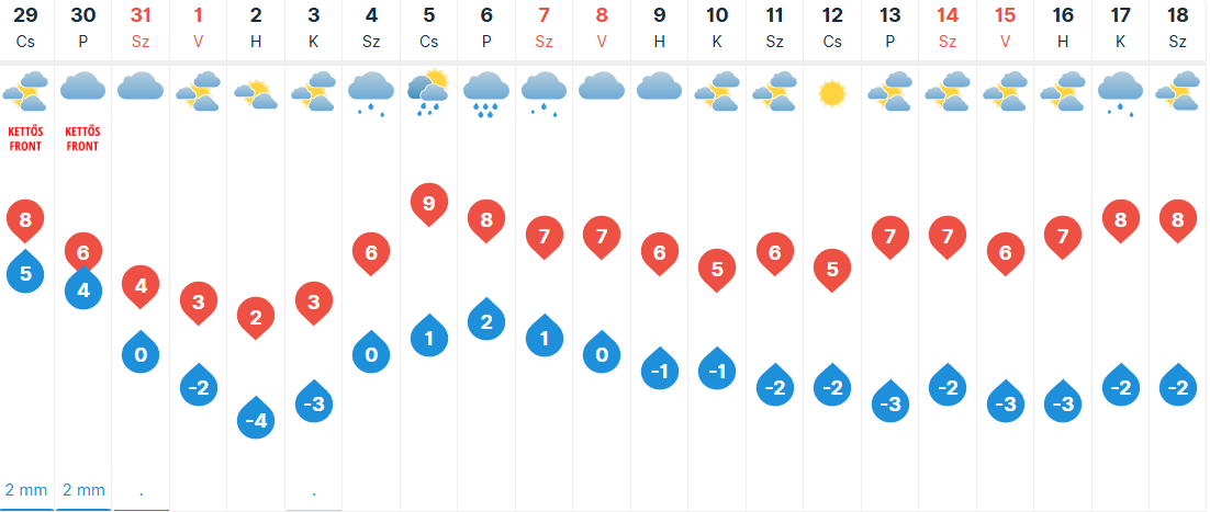 Pénteken többnyire felhős, borongós időre van kilátás. A Dunától keletre alakulhat ki több helyen eső, az Északi-középhegységben havas eső, hó. Keleten, északkeleten élénkülhet meg az északi-északkeleti szél. Kora reggel -2, +2, napközben 1-8 fok valószínű.