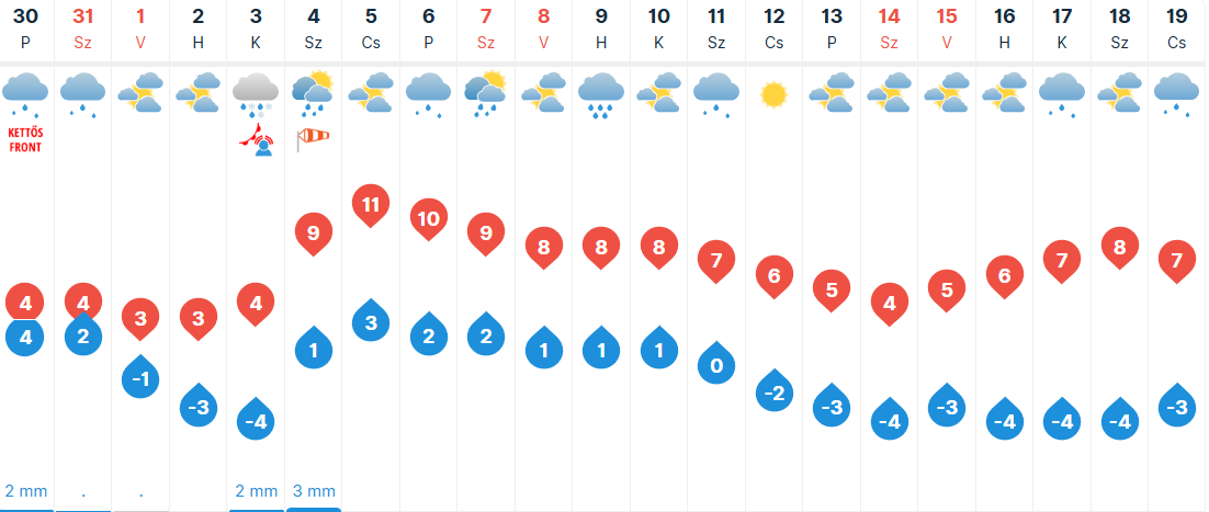 Szombaton túlnyomóan felhős lesz az ég, de néhol szakadozottabb lehet a felhőzet. Eleinte többfelé várhatunk kisebb esőt, havas esőt, havazást, délután pedig inkább már csak délen, délkeleten lehet kevés csapadék. Az ország északi-északkeleti részén megélénkül, néhol megerősödik az északi-északkeleti szél. Napközben 0, +6 fok között alakulhat a csúcshőmérséklet.