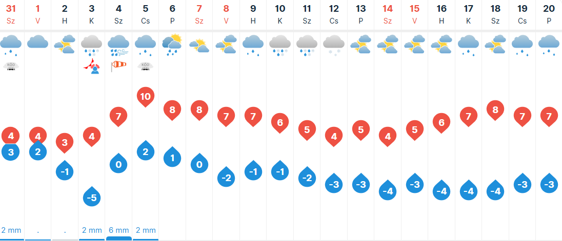 Szombaton ismét túlnyomóan felhős lesz az ég Szeged felett. Eleinte többfelé várhatunk esőt, havas esőt, havazást, viszont délutántól már kevesebb helyen fordulhat elő csapadék. Helyenként megélénkül, néhol megerősödik az északi, északkeleti szél. Hajnalban -4 és +2, napközben pedig 0 és 6 fok között alakul a hőmérséklet.