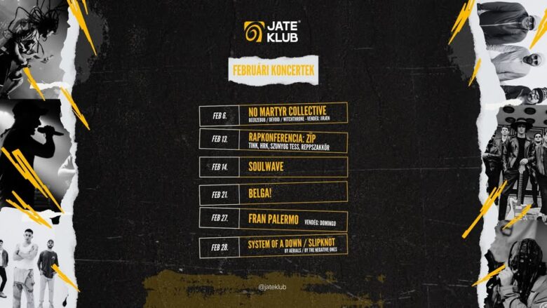 Február 6-án érkezik a No Martyr Collective, színpadra lép a Beerzebub, a Devoid és a Witchthrone, vendégként a szegedi Jiræn. 13-án jön a Rapkonferencia, ahol a zïp csapatát Tink, HRK, Szunyog Tess és a Reppszakkör egészíti ki. 14-én a Soulwave hozza az „Eltört Szívek Klubja” lemezbemutató turné szegedi állomását. 21-én a Belga EGYRE GINDOLUNK Turnéja érkezik Szegedre. 27-én a 15 éves Fran Palermo ad jubileumi estét, vendégük a Domingo. 28-án pedig jön a System of a Down by Aerials és Slipknot by The Negative Ones egy este alatt. Minden program 16+, jegyek a JATE oldalán elérhetőek.