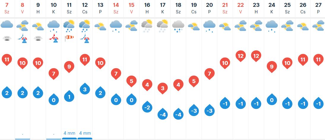Vasárnap már többfelé kisüthet a nap a felhők közül, keleten, északkeleten viszont még a felhőké lesz a főszerep, és időnként esőre is számítani kell, de egy-egy gyenge zápor délnyugaton sem kizárt. Helyenként a Dunántúlon és északkeleten élénk lesz az északnyugati, északi szél. A hajnalra képződő pára, köd helyenként tartósabban is megmaradhat. Reggel -1 és +5, délután pedig 4 és 12 fok között alakul a hőmérséklet.