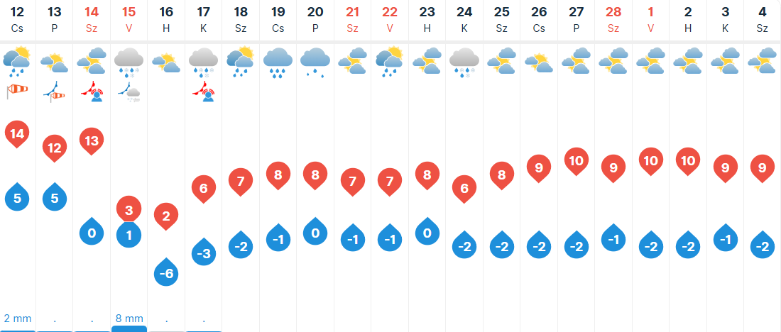 Pénteken egyre jobban szakadozottabb lesz a felhőzet, változóan napos-felhős időben lesz részünk. Egy hidegfront hatására nyugatira, északnyugatira fordul a szél, amelyet élénk, erős széllökések kísérhetnek. Kora reggelre 0 és 6 fok közé csökken a hőmérséklet, viszont napközben 9 és 16 fok közötti maximumokra van kilátás.