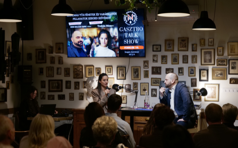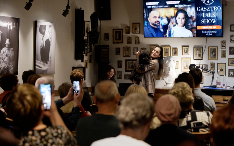 A beszélgetés pont azt a finom rezgést hozta, amiért a GasztroTalkShow-estekről Szegeden sokat beszélünk. Nem harsány volt, hanem közel engedő: csendben ülő nézők, akiket egy-egy történetnél közös mosoly futott végig, és fekete-fehér képek, amelyek nem a látványra, hanem a lélegzetvételre fókuszálnak. Trokán Nóra úgy fogalmazott a videóban, hogy nem egy megszokott backstage-et akart megmutatni, hanem azt az érzést, amikor valaki csak bekukucskál a takarásba. Pont ezt kaptuk: belső tér, halk készülődés, fellépés előtti koncentráció, ami a Dóm téri emlékekkel is összekapcsolódott.