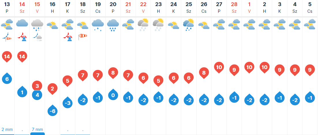 Szombaton nyugat felől egyre jobban megvastagszik majd a felhőzet, beborul az ég, de kezdetben még pár órára kisüthet a nap. A délután második felében és este nyugat felől a Dunántúlon, majd a középső tájakon egyre többfelé elered az eső, késő este pedig az esőt helyenként havas eső, havazás váltja fel. Többfelé lesz élénk a keleti, délkeleti szél. A minimumok -3 és +3 fok között alakulhatnak, majd délután 7-15 fokra számíthatunk.