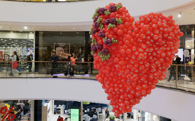 Ami a lufimennyiséget illeti, elárulta: „az tuti, hogy rengeteg”. Szerinte 1000 darab minimum, de a rózsák és a kisebb elemek miatt inkább 1100 körül lehet. Ekkora léptéknél már nem csak a kreativitás számít, hanem a logisztika is: a színtónusok egyeztetése, a felfújás üteme, a kötözések ritmusa. A megvalósítás közben a tér és a közönség áramlása sem mellékes, a szívnek egyszerre kellett látványosnak és biztonságosnak maradnia a bevásárlóközpont színpadán. Szerencsére Gergőnek sikerült minden elképzelésünket felülmúlnia, még egyszer nagyon gratulálunk!