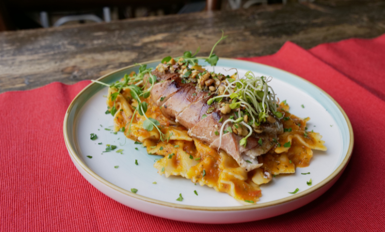 Szeged365 Family, újabb ütős újdonság érkezett a Napfény Műterembe, és most nem csak elmeséljük, videón is megmutatjuk, ahogy elkészül és asztalra kerül a Farfelle alla Mediterranea con Pollo. Sous-vide csirkemell, zöld pesto olaj, szárított paradicsom, fetás töltelék, Fekete-erdei sonkás göngyölés, paradicsomos tagliatelle, a tetején pedig olívaolajos tört mogyoró. Te megkóstolnád?