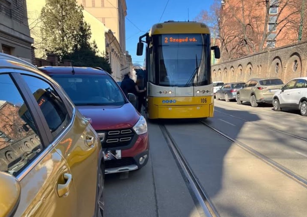 “Jól” sikerült parkolás: egy autó miatt nem tudott haladni a 2-es villamos a Zrínyi utcában