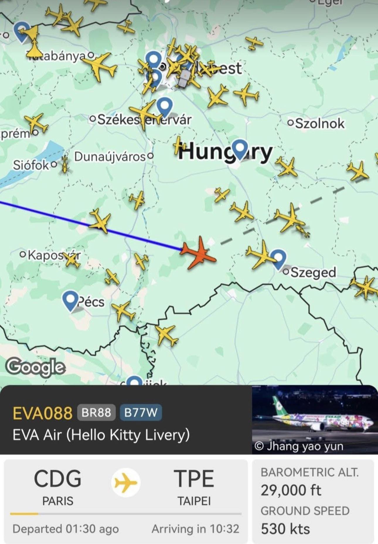 Szegednél húzott el a híres Hello Kitty repülőgép, azaz a tajvani EVA Air légitársaság különleges, a cicalánnyal feldíszített gépmadara – szúrták ki a Flightradar24 egyik magyar csoportjában. A repülőgép azért különleges, mert a légitársaság kívül-belül Hello Kitty-vel díszítette fel a gépmadarat.