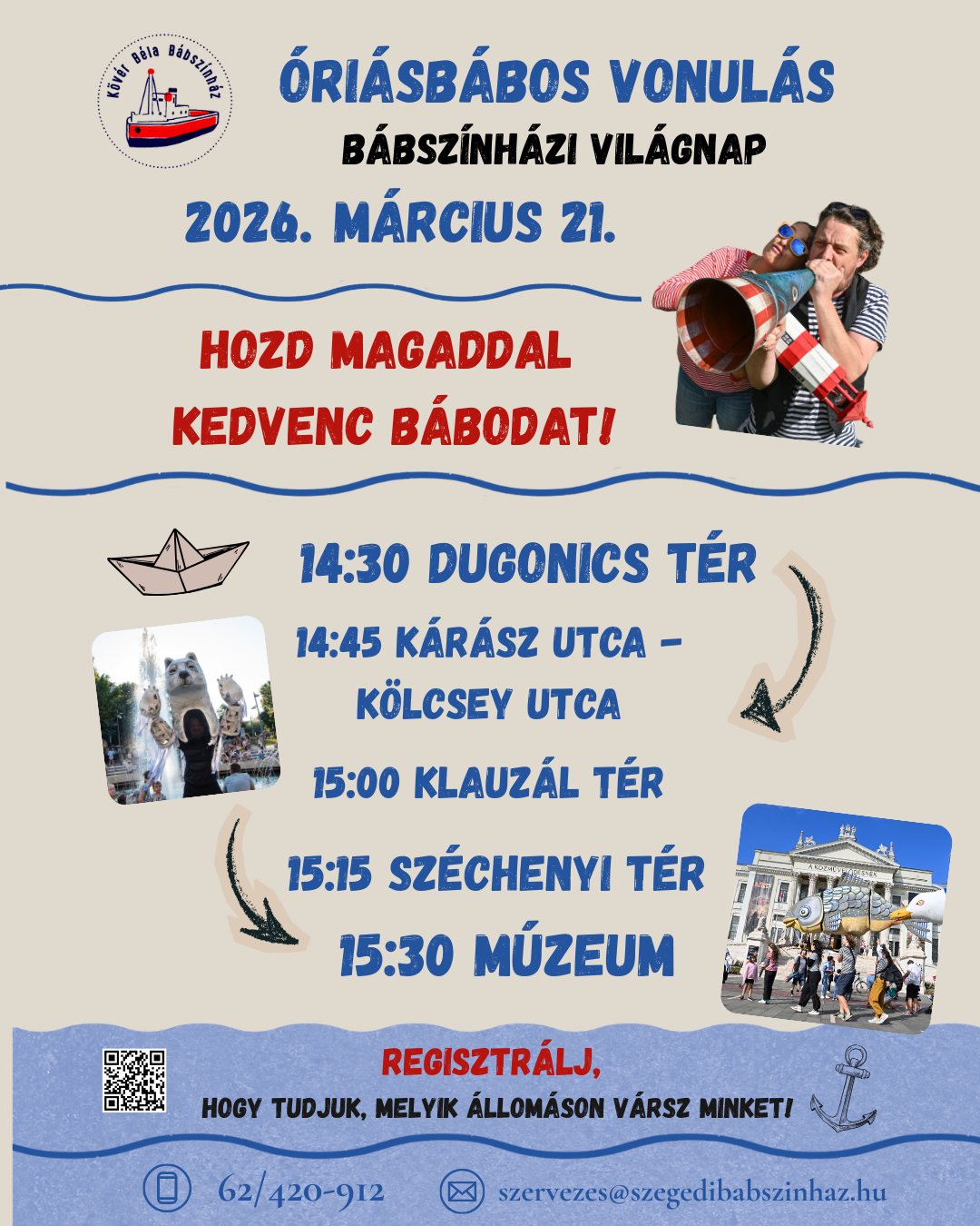 Mókával és kacagással tölti meg idén is a Kövér Béla Bábszínház Szeged főutcáját, ugyanis március 21-én jön a Bábszínházi Világnap! A szegedi társulat most is óriásbábos felvonulással készül a kis lurkóknak, akik a bábosokkal a Dugonics téren, a Kárász utcán és a múzeumnál is összefuthatnak.