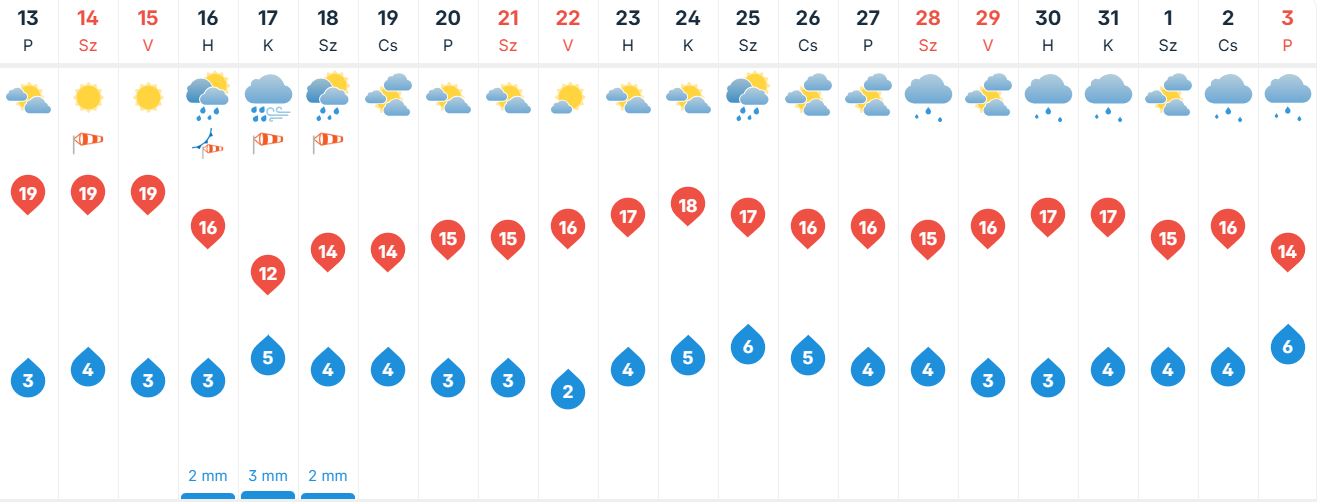 Szombaton is marad az alapvetően napos idő, a gomolyfelhőkből csupán néhol alakulhat ki egy-egy futó zápor. A déli, délkeleti szél a keleti, északkeleti tájak kivételével többfelé lesz élénk, az ország északnyugati harmadán erős. Újra 15 és 20 fok közötti maximumokat mérhetünk.