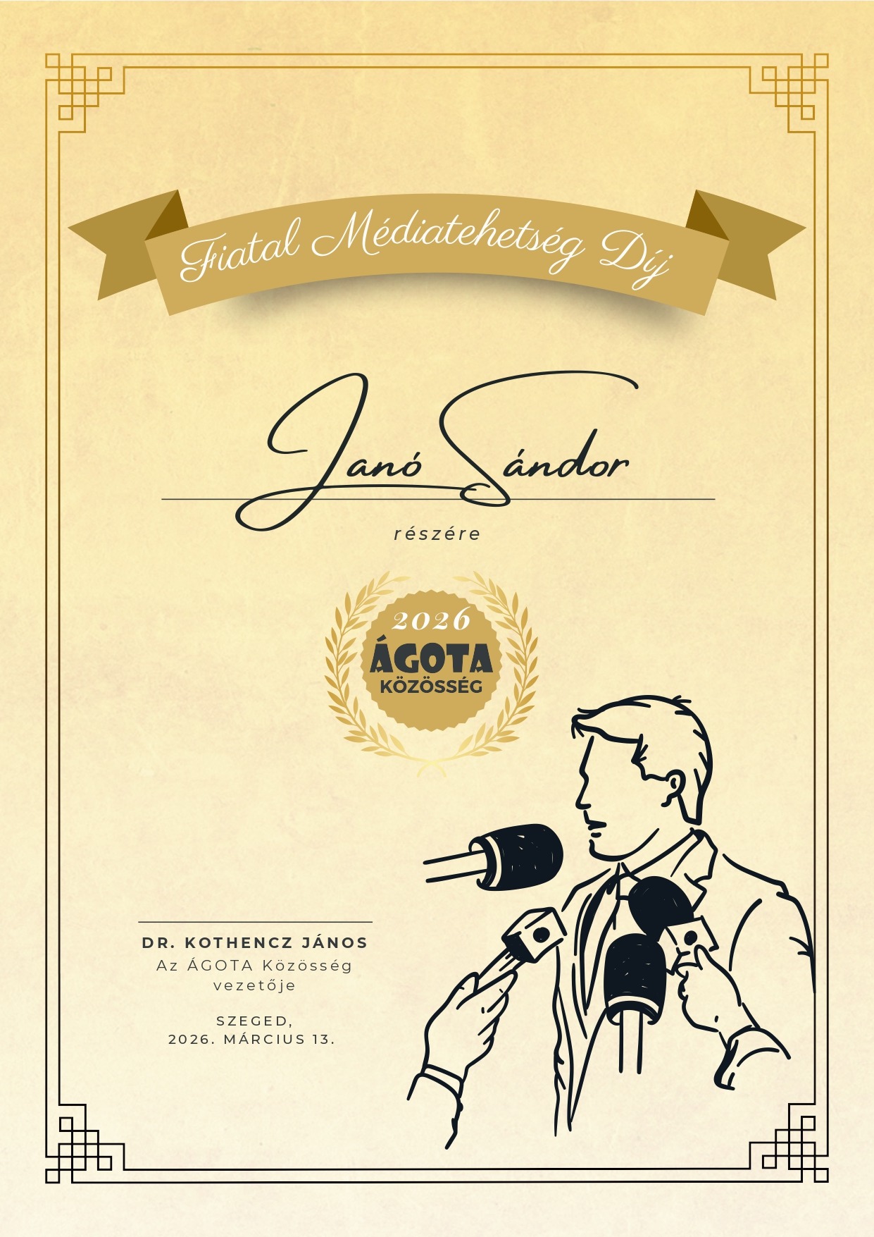 Szívhez szóló, közben nagyon erős üzenetű történet érkezett a Csongor térről: március 15-én, a szabad sajtó ünnepéhez kapcsolódva adta át dr. Kothencz János, az ÁGOTA Közösség vezetője az idén alapított Fiatal Médiatehetség Díjat, valamint két további elismerést. A kezdeményezés egy anonimitást kérő adományozónak köszönhető, és azokat a 14 és 18 év közötti, gyermekvédelmi gondoskodásban élő fiatalokat állítja reflektorfénybe, akik médiaszerepléseikkel sokat tettek azért, hogy a sorstársaik helyzete és az ÁGOTA Közösség értük végzett munkája még több emberhez eljusson!