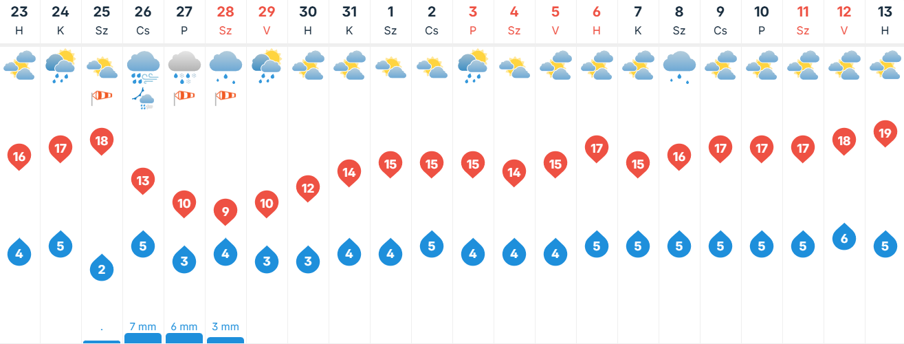 Kedden valamivel naposabb időben bízhatunk, az időnként erőteljesebben megnövekvő gomolyfelhőkből csak néhol alakulhat ki futó zápor. Többfelé élénk, helyenként erős lesz az északi, északnyugati szél. A minimumok -1 és 7 fok között alakulnak, a legmelegebb órákban pedig 14-18 fokot között alakul a hőmérséklet.