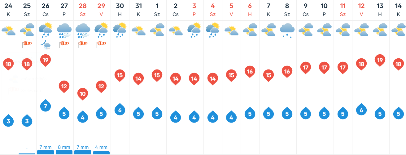 Szerdán fátyol- és gomolyfelhők zavarhatják meg a napos időt, de napközben csapadék még nem várható. Este viszont északnyugat felől markáns hidegfront érkezhet esővel, záporokkal. A déli-délnyugati szél napközben többfelé élénk, főként a Dunántúlon erős lesz. Reggel -2, +6 fok, délután 15-20 fok valószínű.